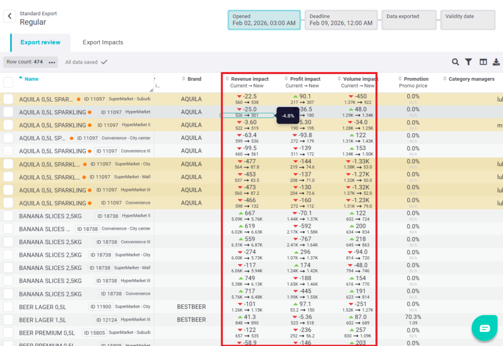 In the Export view, the Impact columns (Revenue, Profit, Volume) have been updated.