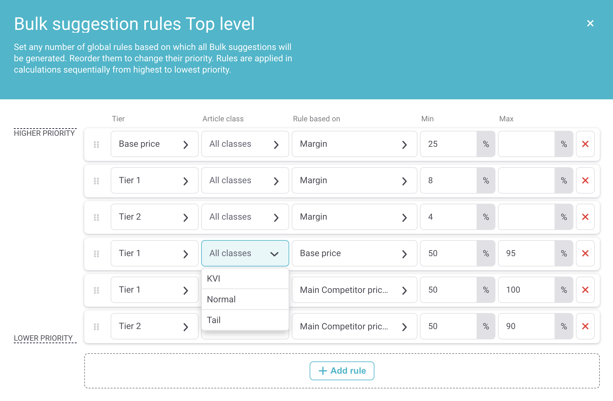 In Suggestion rules it is now possible to set rules based on individual article classes or their combinations thus allowing more diversity and flexibility when generating bulk pricing suggestions.